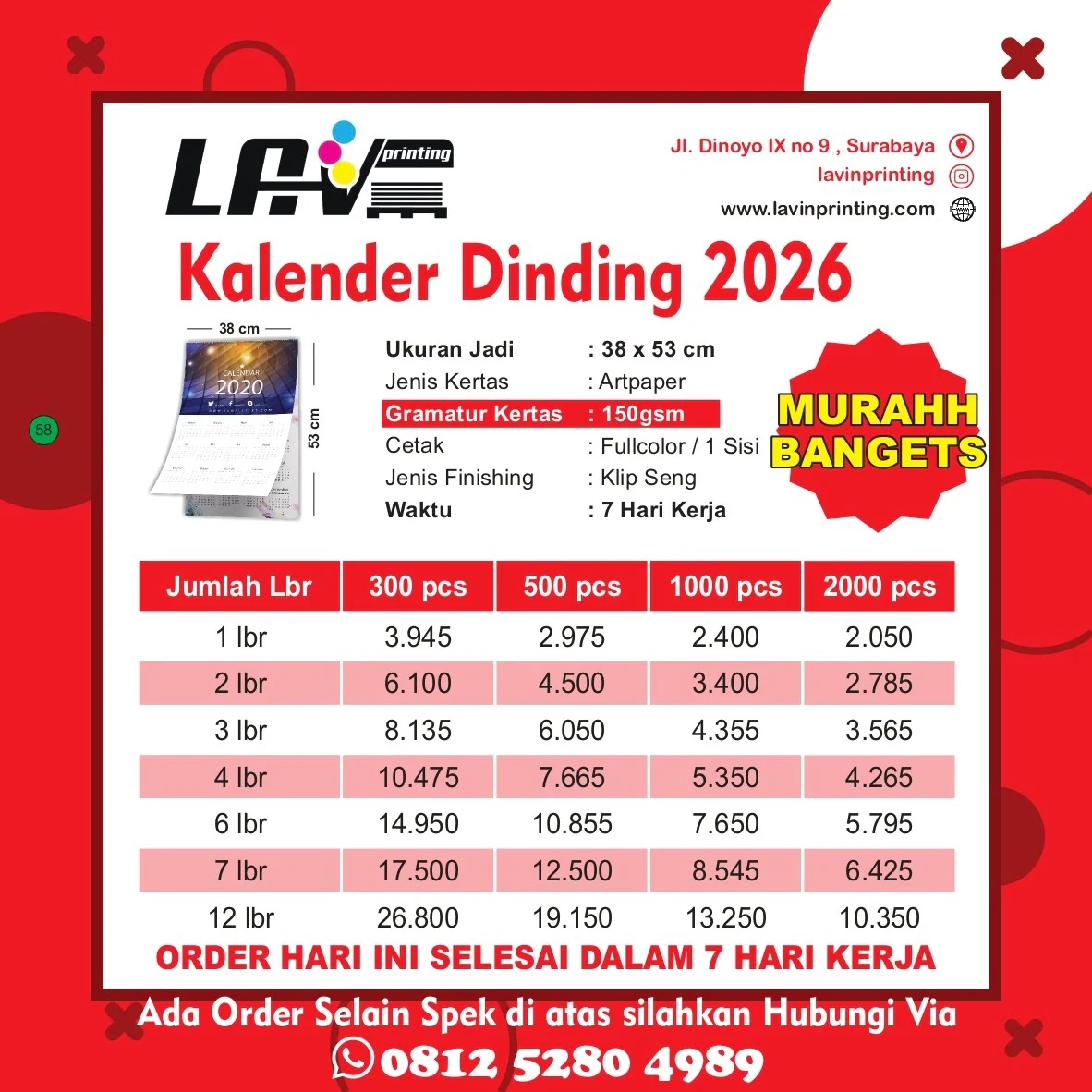 Cetak Kalender Dinding 38×53 cm di LavinPrinting menawarkan tampilan proporsional dengan ukuran yang nyaman dilihat dan informatif. Diproduksi menggunakan mesin cetak berkualitas tinggi sehingga hasil warna lebih hidup, kertas kokoh, dan finishing rapi. Percetakan andalan area Surabaya dan Sidoarjo yang siap melayani dengan pengerjaan cepat serta harga kompetitif.