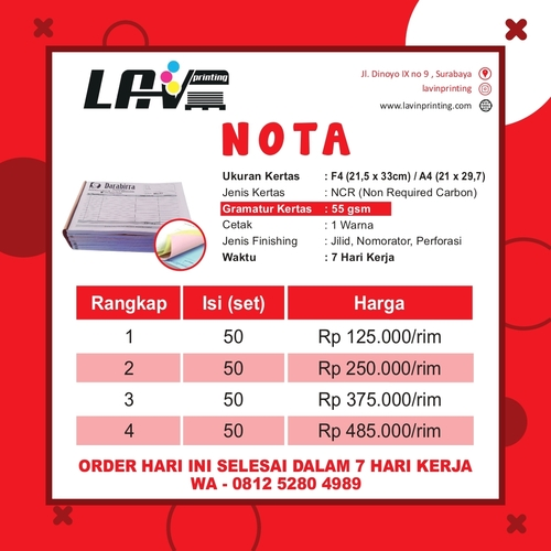 Cetak Nota NCR F4 / A4 di LavinPrinting menawarkan hasil cetak rapi dan profesional untuk kebutuhan transaksi bisnis. Diproduksi menggunakan kertas NCR 55 gsm berkualitas dengan hasil tulisan tembus jelas, dilengkapi finishing jilid, nomorator, dan perforasi. Percetakan andalan area Surabaya dan Sidoarjo yang siap melayani dengan pengerjaan cepat serta harga kompetitif.